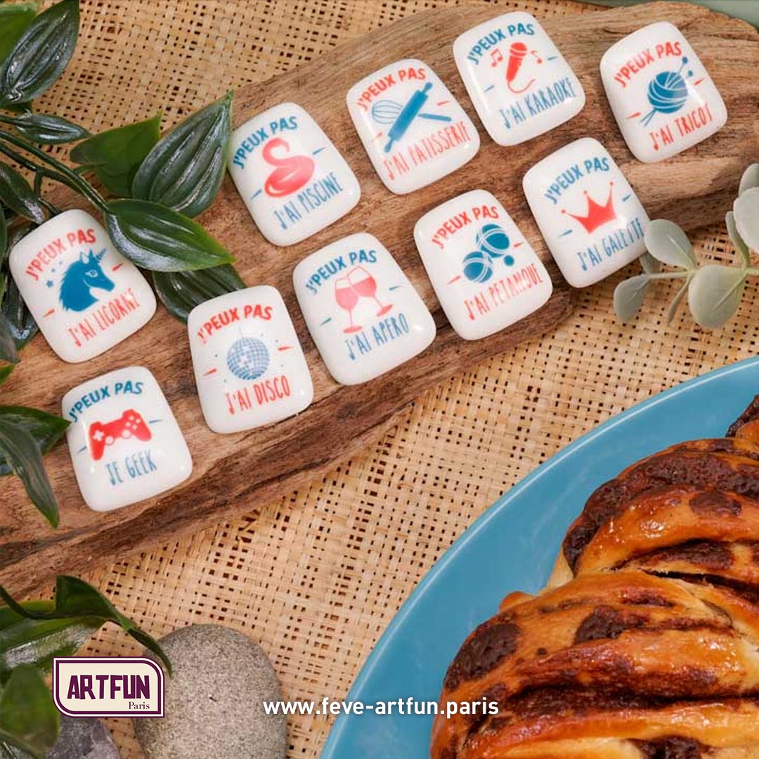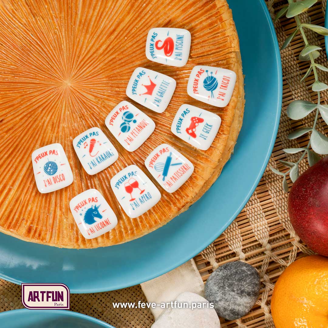 Cette année, égayez l'Épiphanie avec une touche d'humour qui plaira à tous. Retrouvez la réplique culte "J'Peux Pas" revisitée par ArtFun. Cette collection de fèves se prête à encourager la créativité de vos convives et à vous amuser à trouver les fausses excuses les plus insolites. Les Fèves ArtFun en porcelaine véritable sont conçues avec un décor coloré délicatement posé à la main, et une forme bombée qui préserve votre pâte feuilletée, en limitant aussi les risques pour les enfants en cas d’ingestion. Des fèves qui se démarquent, aussitôt propres et brillantes, qui feront la joie des fans de blagues et bonnes réparties.