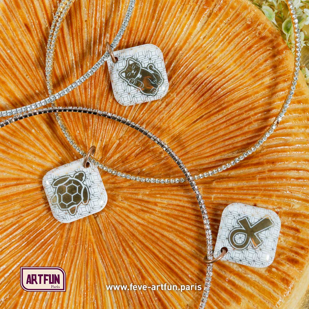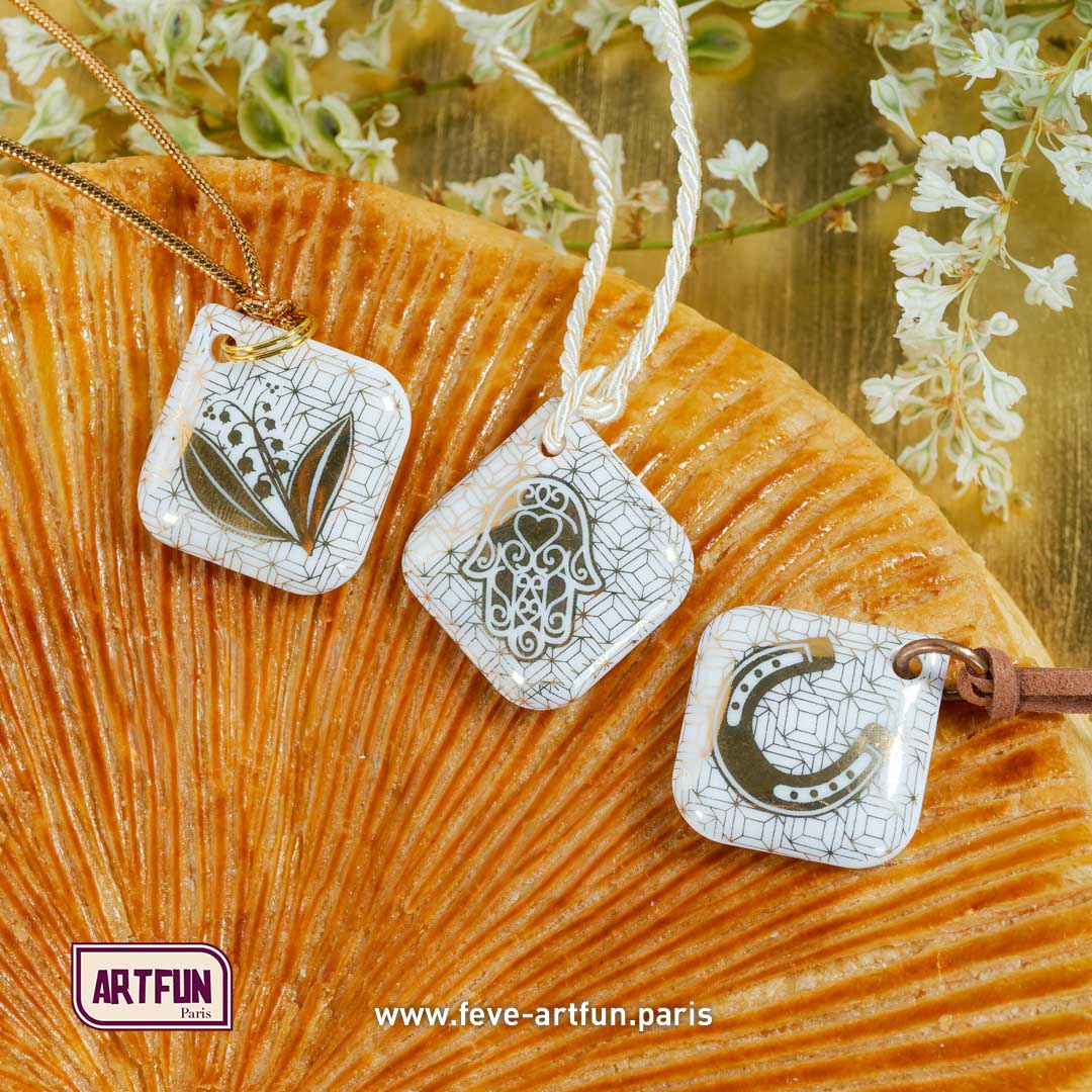 • Particularités : Fève bijou avec dorure, à porter en pendentif ou porte-clés