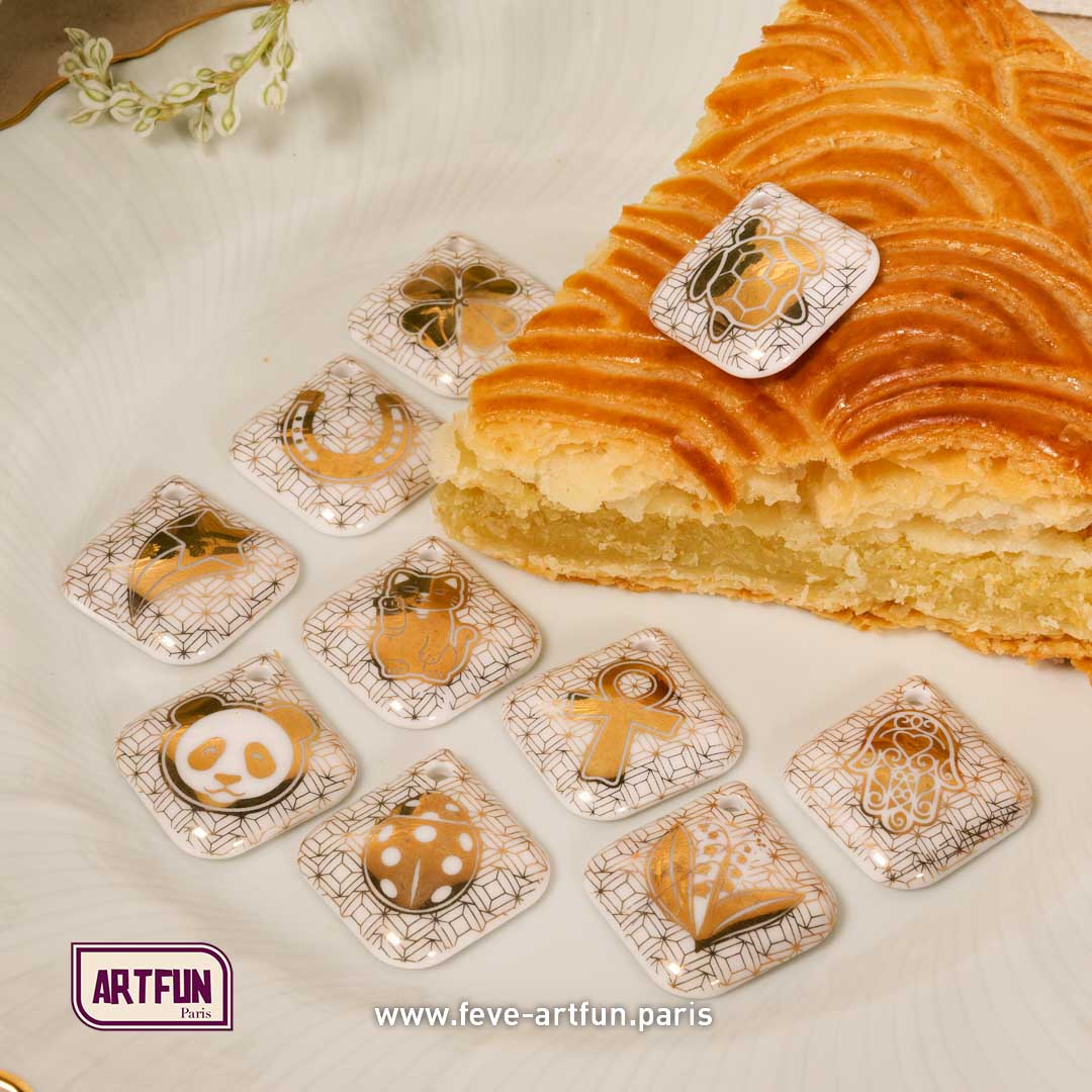 Toutes nos fèves sont en porcelaine véritable, et les décors façon Or sont délicatement apposés à la main.
