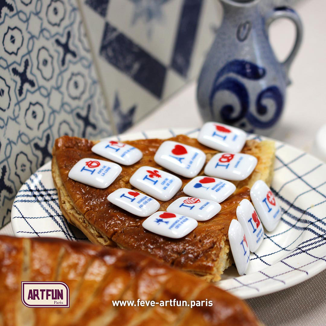 Quelle que soit la recette, une surprise se trouve dans la galette, enfouie dans la crème d'amandes, une Fève ArtFun de la collection I Love my Région. Ces fèves en hommage à toutes nos belles régions de France, sont ornées d’un décor stylisé adroitement posé à la main. La forme en porcelaine, légèrement bombée préserve notamment le feuilletage et limite les risques en cas d'ingestion. Une Fève ArtFun, sitôt sortie de la frangipane, est tout de suite propre et brillante.